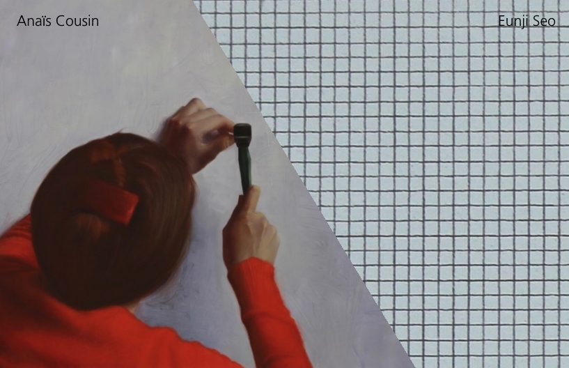 La peinture d’Eunji Seo et celle d’Anaïs Cousin sont proches dans le fond mais sans jamais se rejoindre dans la forme. Eunji Seo, sur fond de grilles mathématiques, fait dialoguer ordre et désordre, espace profond et superficiel. Les toiles d’Anaïs Cousin empruntent les courbes sensuelles de la « réalité » pour dire la beauté. L’Asymptote (une ligne droite qui, indéfiniment prolongée, s’approche d’une courbe sans jamais la toucher) est prétexte à montrer la proximité des deux artistes au-delà de leurs moyens d’expression a priori opposés.