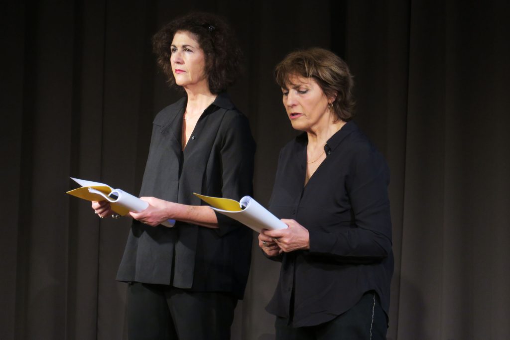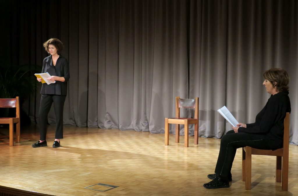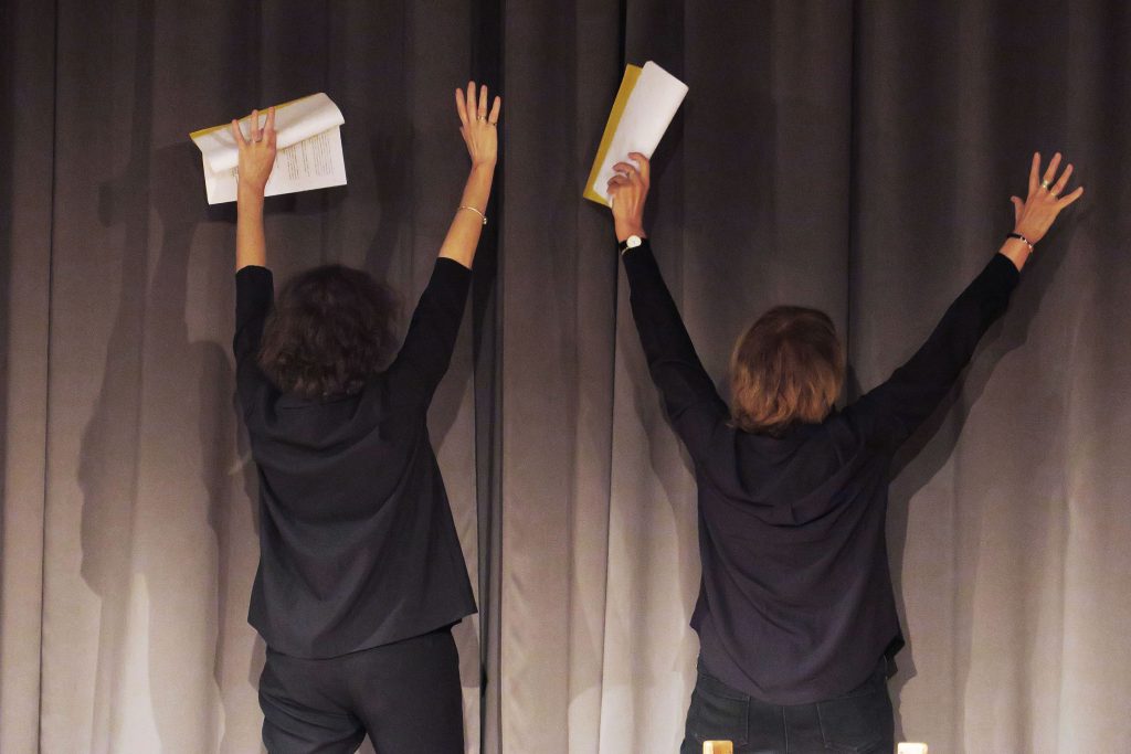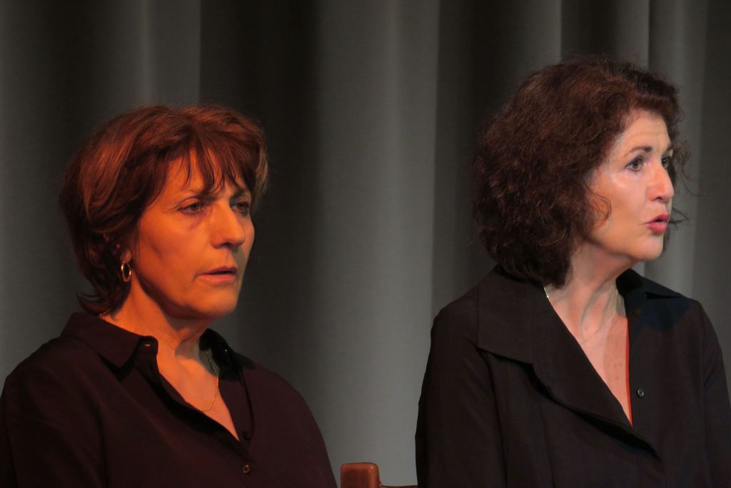 Les comédiennes Gabrielle Calderoni et Lili Spyratos donnent corps et voix à ce texte, accompagnées par la musique de Françoise Sergent.