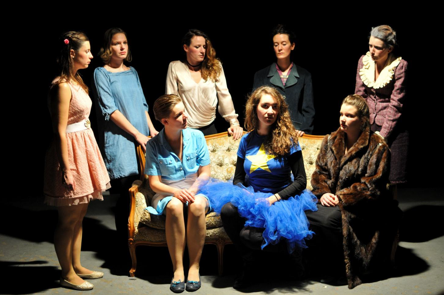 A la simple évocation de Huit Femmes, chacun pense au film de François Ozon réalisé en 2002. Mais c’est bien sur scène que la compagnie Les Marcelles, accompagné du guitariste Christian Sobotzik, propose son adaptation de la pièce de théâtre originale de Robert Thomas, mise en scène par Vincent Simon. Noël approche et la neige tombe sans bruit sur la grande demeure familiale quand Monsieur est brutalement assassiné. Sa femme, ses filles, sa belle-sœur, sa belle-mère, sa sœur et ses domestiques sont rassemblées autour de lui, c’est forcément l’une d’entre elles la coupable… mais laquelle ? L’enquête fait tomber les masques les uns après les autres. Derrière les mensonges et les apparences le vernis craque.