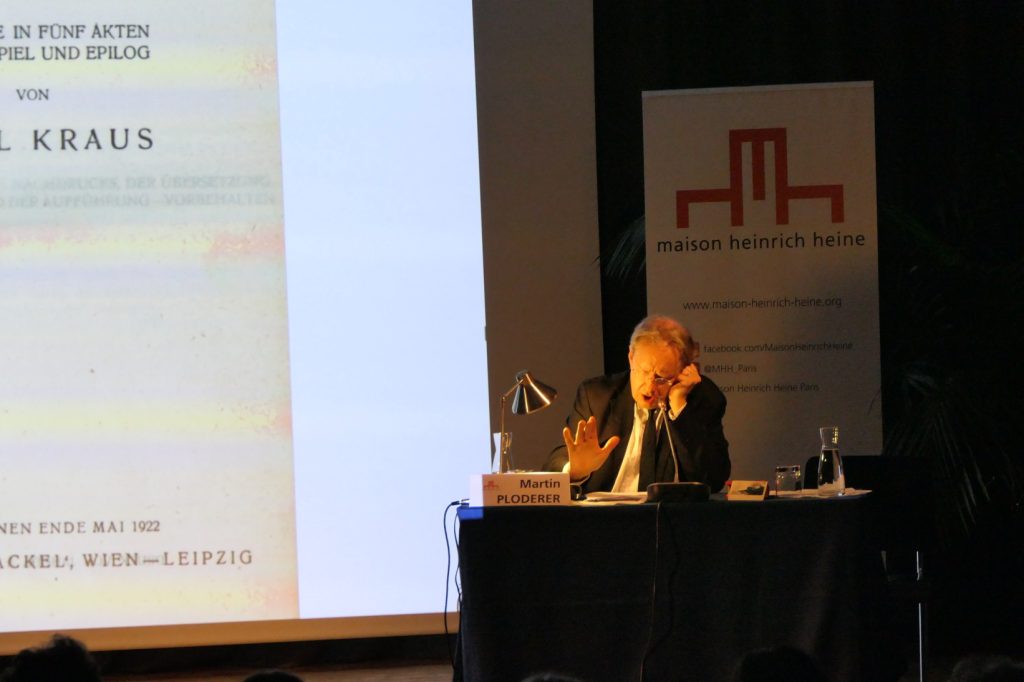 La tragédie Les Derniers jours de l’humanité de Karl Kraus, écrite pendant la guerre, publiée en 1918/1919, compte plus de 200 scènes et des centaines de personnages. Selon Luca Ronconi, Kraus y « assume explicitement le statut de témoin apocalyptique ». Pour Elias Canetti, « la guerre mondiale est passée dans les Derniers jours de l’humanité intégralement… Il n’y a pas une voix qu’il aurait négligée d’entendre. » C’est dans cette tradition de la virtuosité orale que l’acteur autrichien Martin Ploderer a réalisé un enregistrement complet de « l’œuvre dédiée à un théâtre de Mars ».