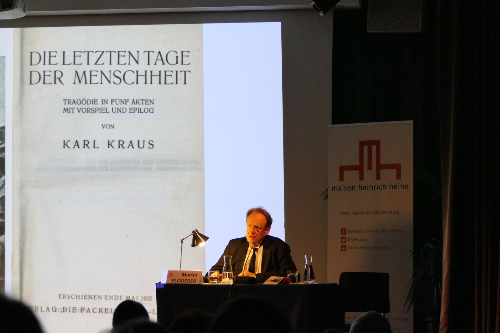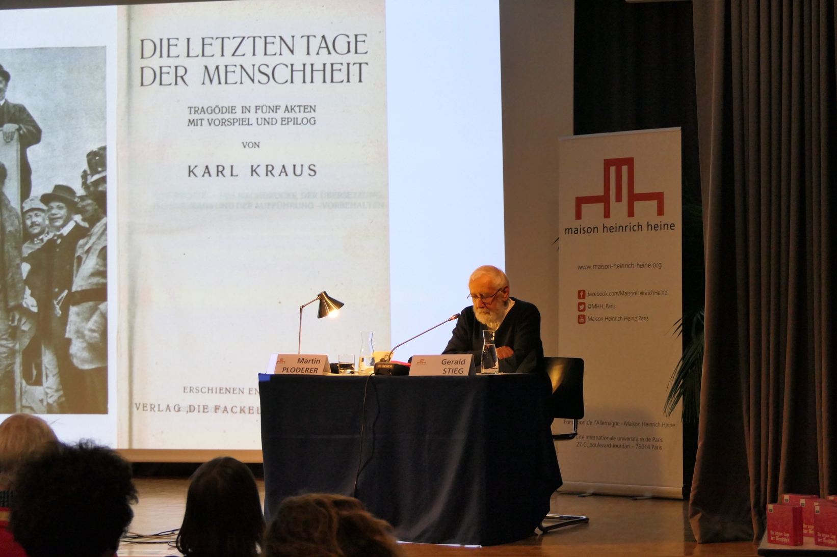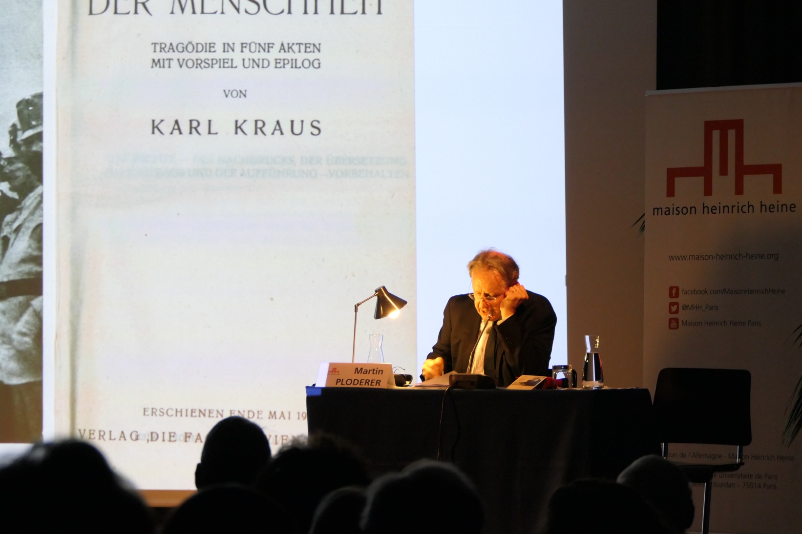 La tragédie Les Derniers jours de l’humanité de Karl Kraus, écrite pendant la guerre, publiée en 1918/1919, compte plus de 200 scènes et des centaines de personnages. Selon Luca Ronconi, Kraus y « assume explicitement le statut de témoin apocalyptique ». Pour Elias Canetti, « la guerre mondiale est passée dans les Derniers jours de l’humanité intégralement… Il n’y a pas une voix qu’il aurait négligée d’entendre. » C’est dans cette tradition de la virtuosité orale que l’acteur autrichien Martin Ploderer a réalisé un enregistrement complet de « l’œuvre dédiée à un théâtre de Mars ».