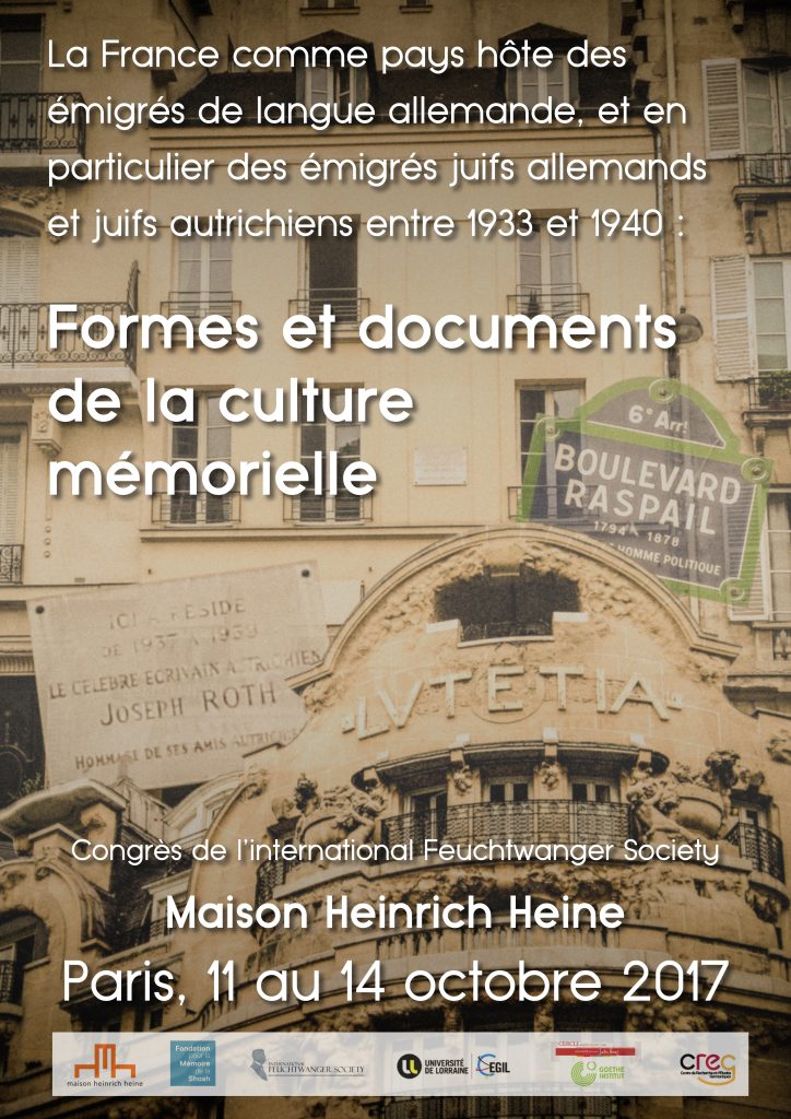 avec le soutien de la Fondation pour la Mémoire de la Shoah en collaboration avec le CEGIL (Université de Lorraine), le CERCLL (Université de Picardie Jules Verne), l’Institut-Goethe et le CREG (Université Paul Valéry, Montpellier 3) en coopération avec la Maison Heinrich Heine