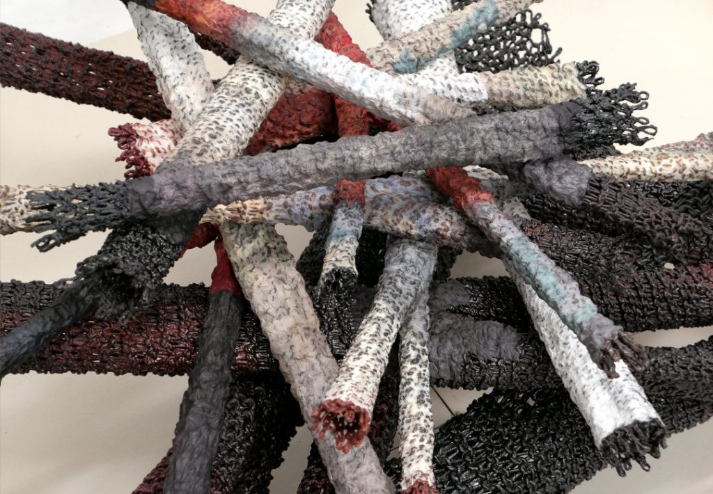 Il n’y a pas d’oiseau dans l’installation de Heike Schaefer, seulement un nid avec un œuf. Les « branches » sont tricotées en ficelle de chanvre et partiellement enveloppées dans du papier coloré japonais. Tous les 500 ans, le phénix plonge dans les flammes pour renaître de ses cendres. À une époque de bouleversements et de menaces, ce mythe peut nous encourager à voir aussi les signes d’une évolution positive.